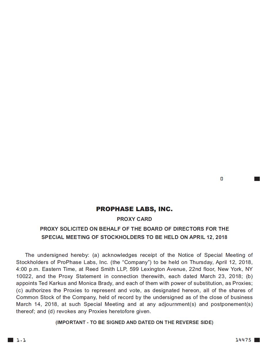You are hereby given notice of and invited to attend in person or by proxy a special meeting of stockholders (the “Special Meeting”) of ProPhase Labs, Inc. (the “Company”), to be held at the offices of Reed Smith LLP, 599 Lexington Avenue, New York, New York 10022, on Thursday, April 12, 2018, at 4:00 p.m., local time, for the following purposes: