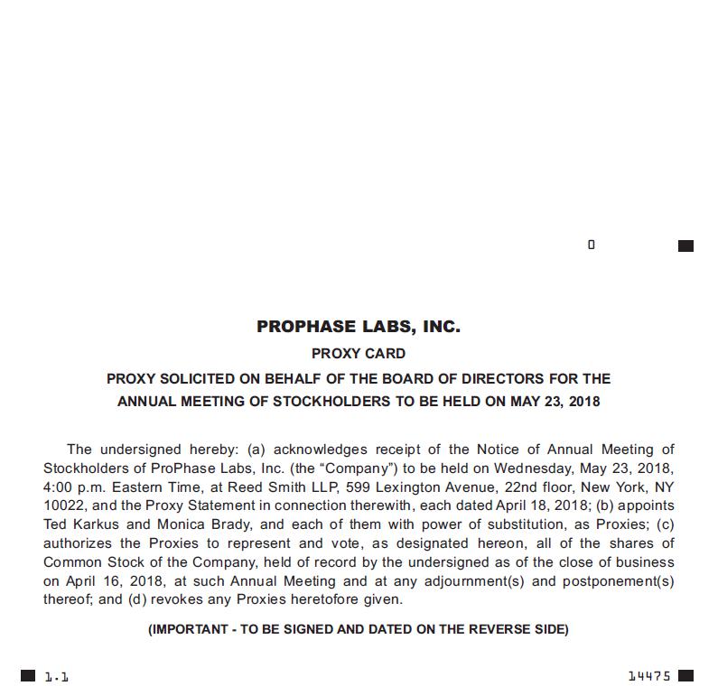 | A: | The Board of Directors (the “Board”) of ProPhase Labs, Inc. (the “Company,” “we,” “our,” or “us,” as the context requires) is providing this proxy statement (this “Proxy Statement”) to solicit your proxy in connection with the Company’s 2018 Annual Meeting of Stockholders (the “Annual Meeting”), which will be held at the offices of Reed Smith LLP, 599 Lexington Avenue, 22nd Floor, New York, NY 10022, on Wednesday, May 23, 2018, at 4:00 p.m., Eastern Time. The Board is requesting your vote on the proposals described in this Proxy Statement. This Proxy Statement and the accompanying proxy card, or voting instruction form, as applicable, are being mailed to stockholders on or about April 23, 2018. |