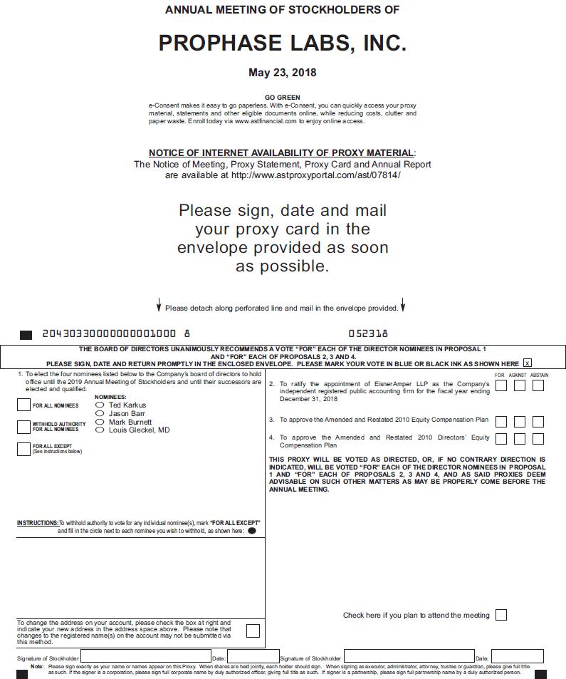 You are cordially invited to attend ProPhase Labs, Inc.’s Annual Meeting of Stockholders (the “Annual Meeting”) on Wednesday, May 23, 2018, at 4:00 p.m. Eastern Time, at the offices of Reed Smith LLP, 599 Lexington Avenue, 22nd Floor, New York, NY 10022. The meeting will start promptly at 4:00 p.m.