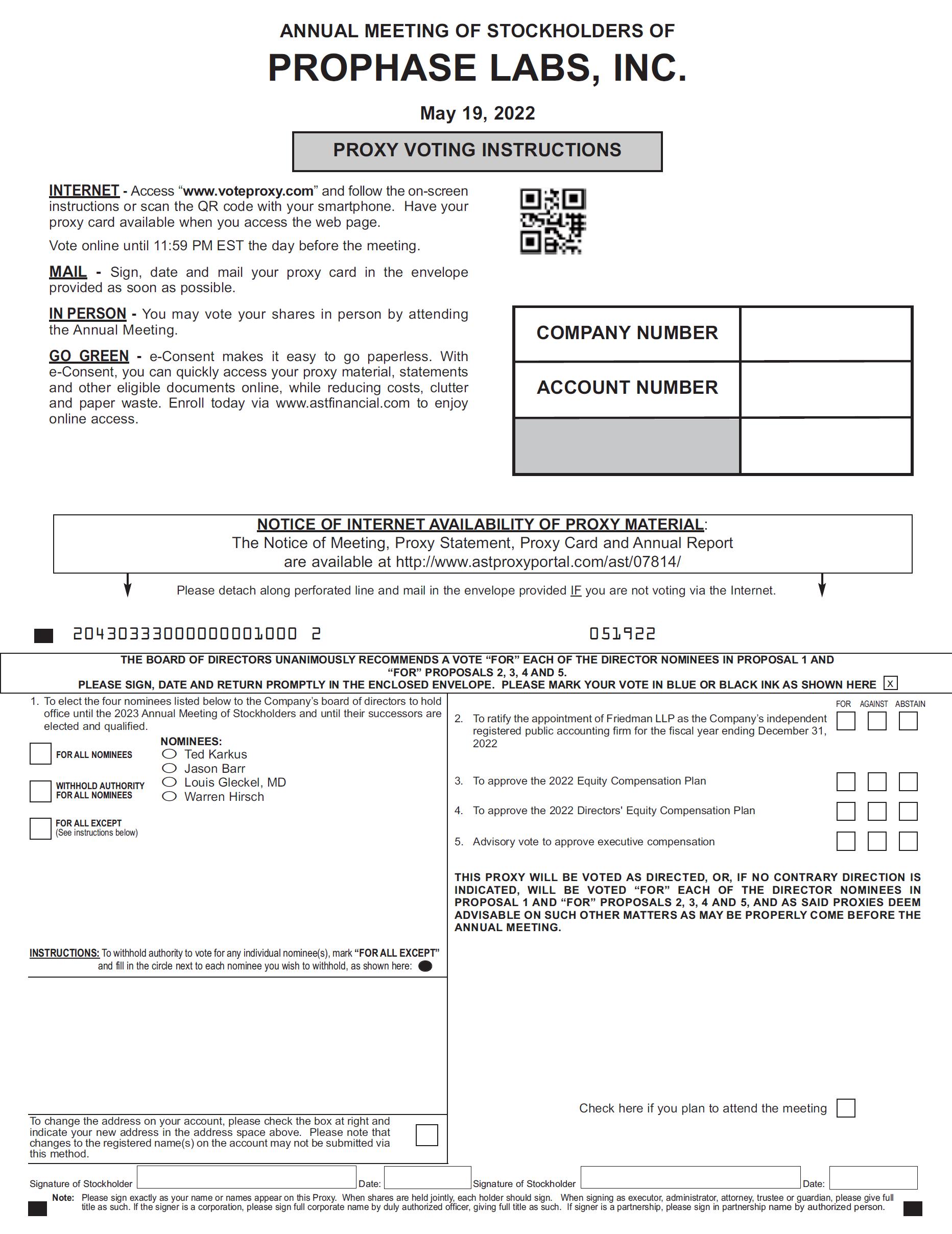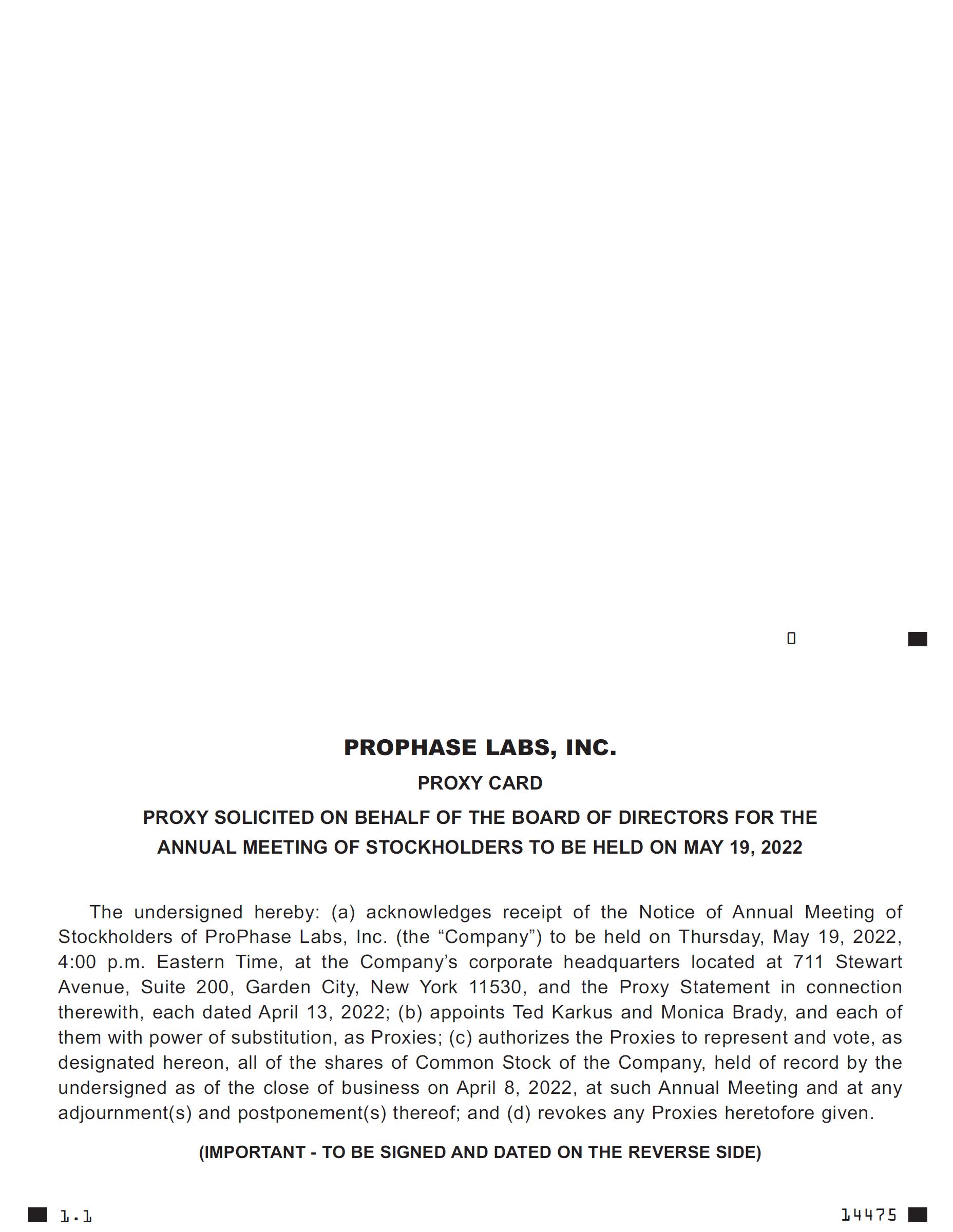 NOTICE IS HEREBY GIVEN that the 2022 Annual Meeting of Stockholders (the “Annual Meeting”) of ProPhase Labs, Inc. (the “Company”), a Delaware corporation, will be held at the Company’s corporate headquarters located at 711 Stewart Avenue, Suite 200, Garden City, New York 11530, on Thursday, May 19, 2022, at 4:00 p.m., Eastern Time, for the following purposes: