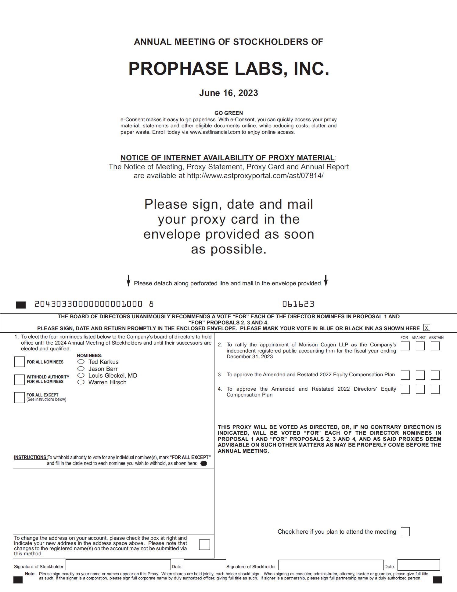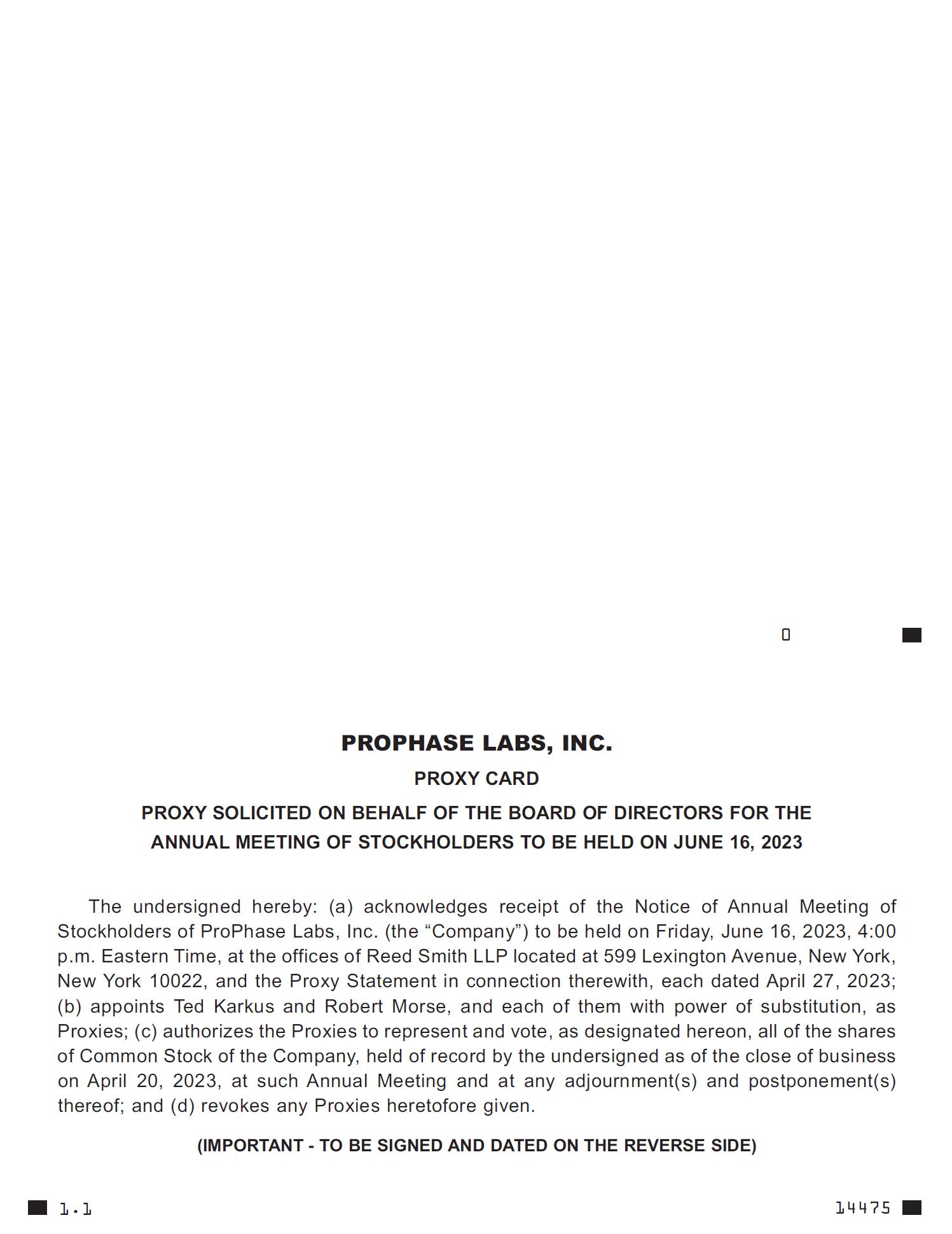 NOTICE IS HEREBY GIVEN that the 2023 Annual Meeting of Stockholders (the “Annual Meeting”) of ProPhase Labs, Inc. (the “Company”), a Delaware corporation, will be held at the offices of Reed Smith LLP, located at 599 Lexington Avenue, 22nd Floor, New York, NY 10022, on Friday, June 16, 2023, at 4:00 p.m., Eastern Time, for the following purposes: