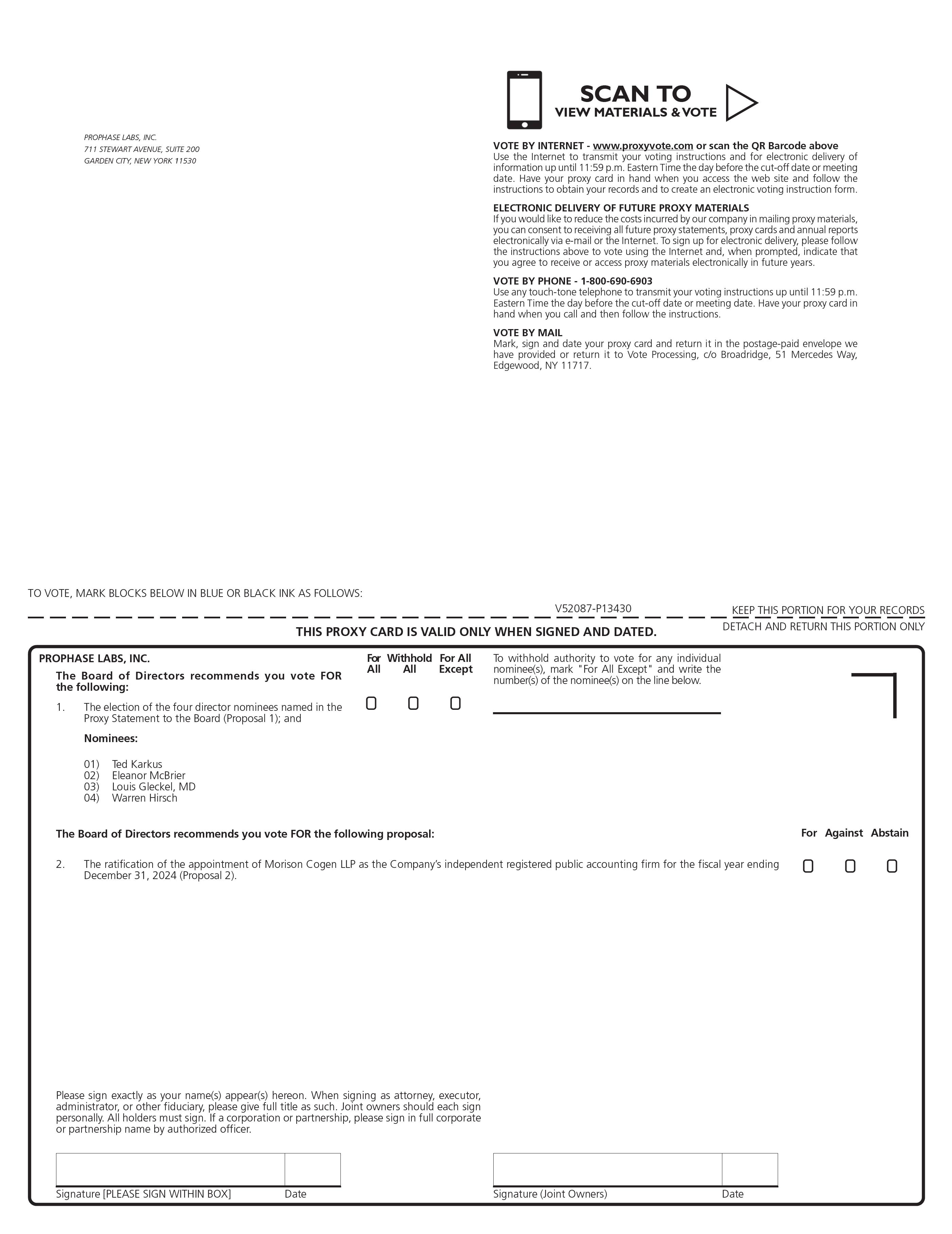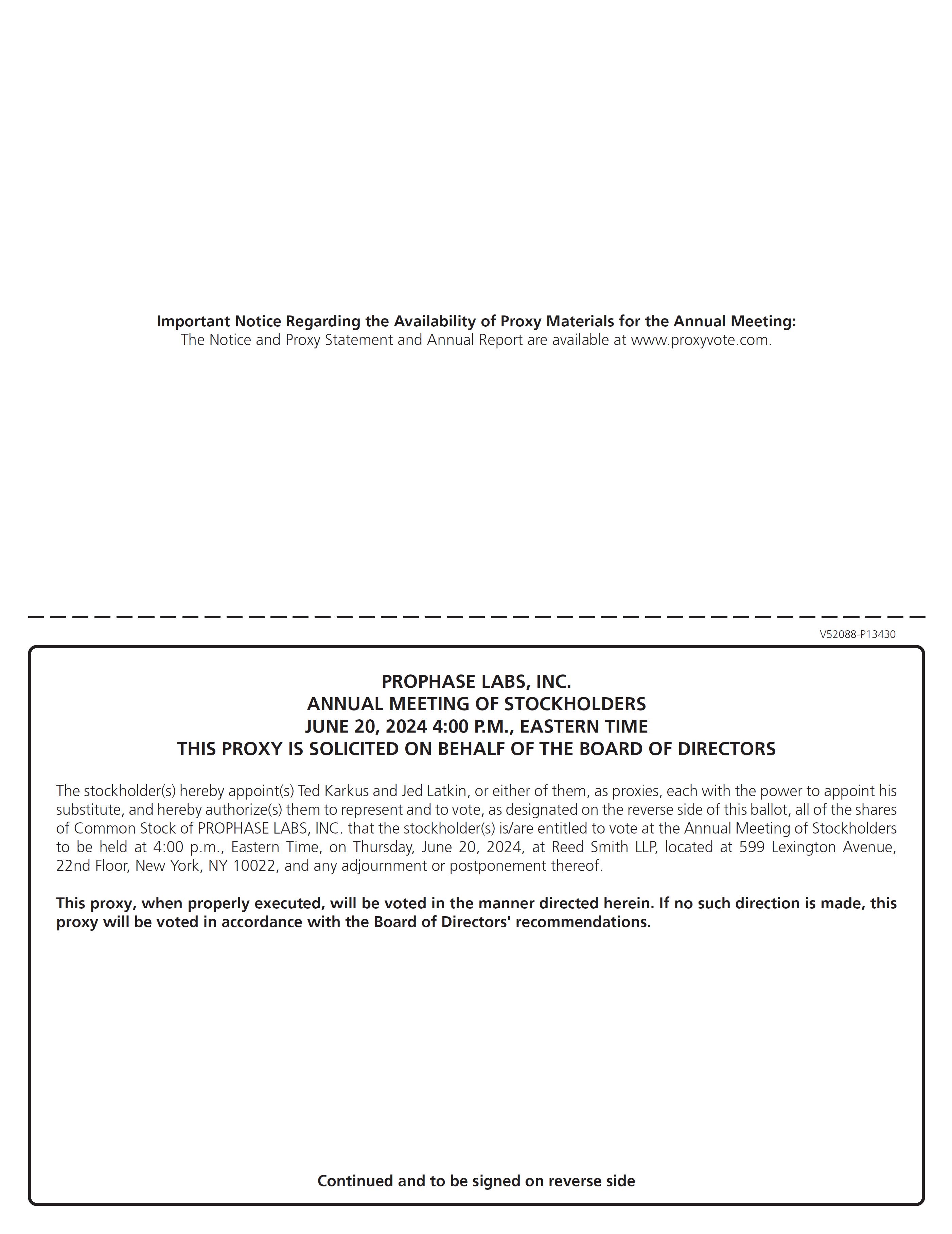 NOTICE IS HEREBY GIVEN that the 2024 Annual Meeting of Stockholders (the “Annual Meeting”) of ProPhase Labs, Inc. (the “Company”), a Delaware corporation, will be held at the offices of Reed Smith LLP, located at 599 Lexington Avenue, 22nd Floor, New York, NY 10022, on Thursday, June 20, 2024, at 4:00 p.m., Eastern Time, for the following purposes: